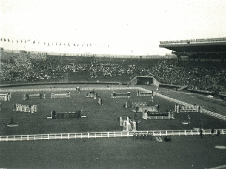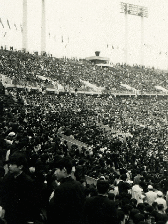 画像は最終日の馬術競技を観戦したときで、手札サイズのプリントをスキャンしたものである。ハーフサイズのキヤノンダイヤル35と思うが、ネガは残っておらず正確には判らない。 |