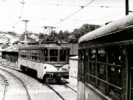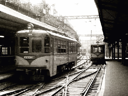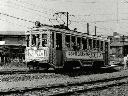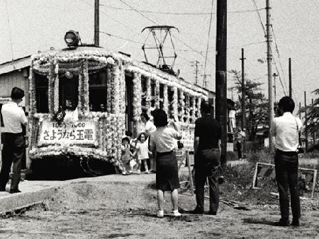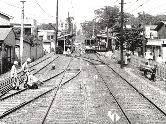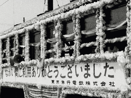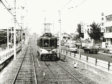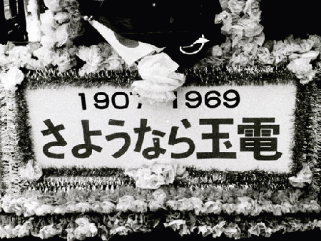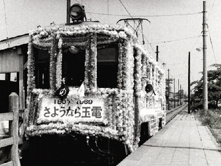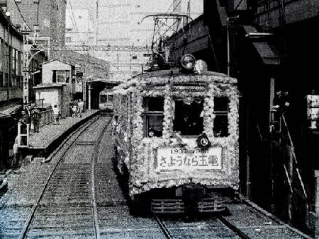 東急・玉川線は明治40年(1907年)に玉川電気鉄道が二子多摩川付近の砂利を東京都心に輸送することを主目的として、渋谷〜玉川 9.1km を開業したのが始まりである。支線である砧(きぬた)線は大正13年(1924年)玉川〜砧(のちの砧本村) 2.2km / 下高井戸線は大正14年(1925年)三軒茶屋〜下高井戸 5km が開業している。 昭和13年(1938年)東京横浜電鉄に合併された。 昭和44年(1969年)5月10日、東急電鉄・玉川線 / 砧線が廃止になった。廃止までの3日間、花電車が運転されていた。 |