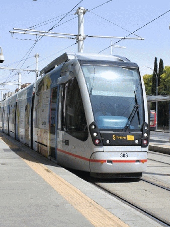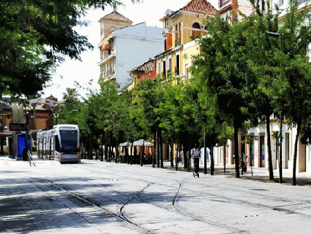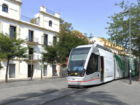 街並みを走行するセビリア市電を撮影していたが、15:00〜16:00頃は運行数は少なかった。また近代的な車両で、同一形式にしか遭遇しなかった。